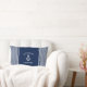 Nautical stripes and anchor label "Atlantic Sailing" on front of blue and white lumbar pillow. Backside of pillow just blue. Beautiful decor for nautical living room and bedroom. Customize and write you own text on it.