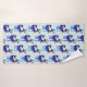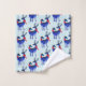 Patterned bath towels with a light greenish blue background. Illustrated with a pair of blue scandinavian deer wearing red scarves. Decorative markings on their bodies.