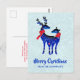 A holiday postcard which says Merry Christmas and a personalized message on the back. Designedwith a light green and white snowy looking background. Illustrated with a pair of blue scandinavian deer wearing red scarves. With decorative markings on their bodies.