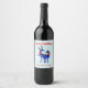 Personalized wine bottle label with a light green and white snowy looking background. Illustrated with a pair of blue scandinavian deer wearing red scarves. With decorative markings on their bodies.