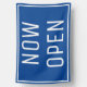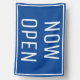 Blue now open sign flag. Simple white on blue flag with a frame.