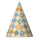 This groovy boys 1st birthday paper hat design captures 70s vibes with a cute blue theme, and a pastel chequered background. Fully customizable, it includes space for a name in a retro script and a smile. Perfect for a "One cool dude" boho birthday.