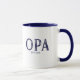 Opa coffee mug design with established year featuring a blue stamped font set on a white background. Click customize to edit the background color!. Visit our shop to view this mug in a large assortment of grandfather names.