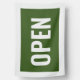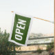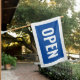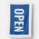 Blue and white open sign flag with a bold font and white border.