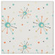 Add some fun to your sewing projects with this cute turquoise blue, two shades of orange, cream, and black atomic starburst pattern mid century modern fabric.