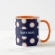 A loud blue & orange flash pattern on a coffee mug. Use "Personalize this template" to change the "SAM'S MUG" name and text and create a unique, customized gift; text changes are reflected on both sides. Liven up someone's coffee break with this bold mug design, featuring a repeating flash with reddish orange outline and light blue centre.