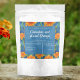 This elegant waterproof editable bath salts pouch label measures 4 inches by 3.5 inches (102 mm by 89 mm). It has a border featuring bright orange and yellow marigold flowers surrounding a bright blue panel with white text with space for your company name, product name, ingredients, product description, and business contact information. This label is designed as a label for bath salt pouches, but it could also be used a a label for large cosmetic jars or other larger cosmetic containers.