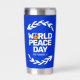Celebrate the International Day of Peace (aka World Peace Day) on September 21 with this tumbler, which shows a bright orange peace sign standing in for the letter O in world, encircled by laurel leaves on a calming blue background. Reverse shows identical design.