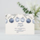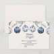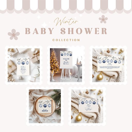 This elegant baby shower design features a trio of hand-painted blue Christmas ornaments hanging from twine and pine branches. With delicate snowflakes and botanical motifs in a soft watercolor style, this winter theme is perfect for celebrating a baby boy during the cozy holiday season.