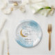 Dreamy boy's baby shower paper plate featuring the sky in watercolor blue with faux gold glitter stars and moon. The text says "we're over the moon."