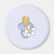 A blue pacifier with a daisy on a striped blue and white background on baby boy magnets and buttons that you can cusotmize with a name.
