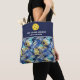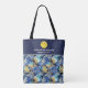 Super cute double-sided tote bag for your pickleball paddle and gear. Design features a yellow pickleball, two lines of custom text set above a colorful blue, gold, white tropical palm tree leaf pattern. Get matching ones for your club, team or pickleball trip . . . Makes a nice gift for the pickleball player in your life.