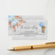 A bring a book request, ticket insert for a baby shower. A faux silver looking background. Decorated with light blue florals, pampas grass, and a teddy bear boy holding a blue balloon.