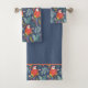 Here is a towel set that features a fun tropical pattern featuring a pink, red, gold and blue parrot. Along with the repeated parrot images are soft blue tropical leaves and pink flowers. The bath towel has the pattern as a border on each end, with a matching blue center. The hand towel and the wash cloth have the tropical parrot pattern alone. Unique and attractive! * Be sure to see the matching home decor products in our store, including a shower curtain and bath mat.