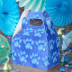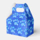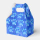 Blue paw print pattern. Custom party favor boxes for treats and gifts. Blue watercolor background.