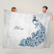 Keep warm on chilly fall and winter nights with a Blue Peacock Personalized Fleece Blanket. Blanket is a visually striking item, featuring a vibrant metallic blue peacock with iridescent feathers shimmer with hues of sapphire blue, and cobalt, creating a bold and luxurious focal point. Set against a gray grunge background, adorning the design are delicate white leaf botanicals, intricately woven around the peacock. These leaves add a touch of elegance and nature-inspired softness, softening the grunge background’s roughness while complementing the peacock’s regal presence. Elegant script lets you add your name or recipients name for a personal gift.
