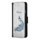 Protect your iPhone with this elegant Blue Peacock Personalized iPhone Wallet Case. Case design features a vibrant blue peacock resting on a white leaf vine against a gray grunge background. Additional gift items available with this design as well as a variety of colors. Personalize for yourself or makes a great gift.