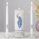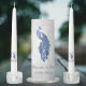 Personalize special candles for your wedding ceremony with a set of Blue Peacock Wedding Unity Candle Set. Candle design features a vibrant peacock resting on a delicate white foliage vine against a grunge background. Personalize with the groom and bride's names along with the wedding date, and taper candles with surnames. Additional wedding stationery and gifts available with this design as well.