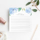 Chic floral notepad features a top border of watercolor peony flowers in soft shades of blue with lush green leaves. Personalize with two lines of custom text in modern lettering; shown with the French greeting "bonjour" and your name. Lined.