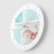 Remember the birth of your new baby with the sweet aqua blue diagonal gingham pattern wall clock with numbers. Personalize by adding a photo, name, and date of birth of your baby boy.