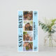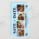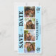 Blue wedding save the date card with photo booth styled picture collage. Personalize with your personal wedding details and newlywed couple photographs.