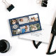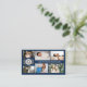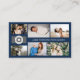 Dark blue business card for a professional photographer, where you can showcase your work in a photo collage with room for six of your photos in three different sizes. Add your name or business name and logo on the cover. This design works best with a light logo, because of the dark blue background. Add your contact information on the back. An elegant, minimalist business card, perfect for a wedding photographer, or even makeup artist, artist, jewelry designer and much more.