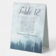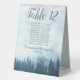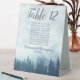 These wedding table number tent signs feature a rustic design with blue pine trees shrouded in mist or fog. There is space for the table number plus 10 names to make it easy for your guests to find their seats.