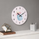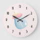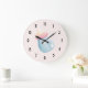 A clock with a cute image of a light blue baby bottle with a pink rim.