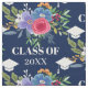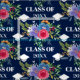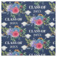 Pretty floral graduation fabric in blue with a white graduation caps surrounding a floral arrangement in pink, blue, purple, and orange. Personalize with the year in an elegant white font.