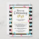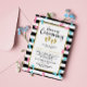 Cute naming ceremony invitation for twin siblings with footprints in gold, pink, and blue scattered over a black and white striped background. Naming ceremony is written in a charming script. Add your twins' names and the details of the naming ceremony.