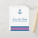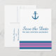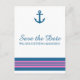Elegant and classic Nautical Anchor Save the Date Postcard with a simple boat anchor and an array of stripes in dark navy blue and pink. This nautical beach themed save the date can be easily customized with your wedding details. For more customization options, click on the Customize It button.