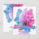 A budget baby shower or gender reveal invitation. On a white background the design consists of elegant blue and pink smoke, that contains the baby's surname followed by gender reveal within black typography text. A couple in pink and blue t-shirts are seen watching the smoke while surrounded by love heart shaped blue and pink balloons. Personalise by adding your full event and contact details to the front and back.