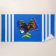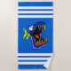 A vibrant blue striped beach towel with a colorful sharp spiky toothed piranha fish featured in the center.
