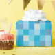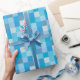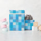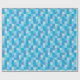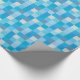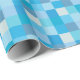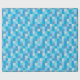 This wrapping paper features squares in different shades of blue in a pixelated pattern.