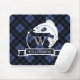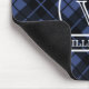 Mousepad printed with a blue plaid pattern and a fish hook and leaping fish monogram featuring your name and initial in white.