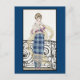Vintage fashion artwork showing a young woman in a narrow blue plaid skirt. She's standing in front of an ornate iron balcony railing
