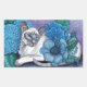 Original watercolor painting by Sandra Gale, featuring a blue point Siamese cat, surrounded by blue flowers on a pale purple background. Flowers are blue hydrangea, and blue poppies. Great design for cat lovers and those who especially like the Siamese breed. Perfect for bedroom wall art or framed with matching image. Matching watercolor painting of a chocolate point Siamese also available in my EverIrisPrints store.