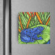 Image is my original acrylic painting. This vibrant blue poison frog with black spots is sitting on a bright green lilly pad in the water with green grass and yellow rods behind him. The background sky is vibrant orange. See my store Art by MAR for matching products with this design.
