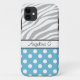 Custom iPhone 5 case personalized with your name, and designed with a blue & white polka dot pattern and a faded zebra print pattern with gray & white zebra stripes.