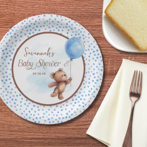 Blue Polka Dot Teddy Bear Baby Shower Favor Boxes An all-over polka dot print. FRONT: Personalized with your name and date. BACK: A teddy bear holding a blue balloon with a sky background. Customize the message on back. © Kimbellished, LLC