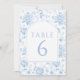 Classic elegant blue chinoiserie porcelain inspired floral pattern boho arch spring or summer wedding table numbers with bride and groom names.