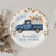 Boy's autumn foliage pumpkin truck baby shower paper plate featuring a dark blue truck and light blue and orange pumpkins. This design also features some brown foliage and dots. This fall themed pumpkin truck boy's baby shower plate is ideal for a baby boy's fall baby shower.