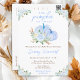 This cute and whimsical watercolor baby shower invitation features pastel blue pumpkins and beautiful floral arrangements. The text combines handwritten script and sans serif fonts for a stylish and modern look. This is perfect for an autumn fall baby shower.