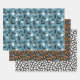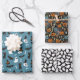 A set of wrapping paper sheets for Halloween featuring three patterns in matching styles: ghosts, skulls, ravens, bats and cats in blue, white, orange, and black; happy pumpkins and mushrooms with spiderwebs; and lots and lots of ghosts. Fun and kid friendly gray, black, and orange Halloween wrapping paper set for Halloween boy baby showers, Halloween boy birthday parties, and Halloween costume parties or any other fun and spooky Halloween event. Boy Halloween wrapping paper set for all your fun Halloween events in a blue version of the Halloween palette.