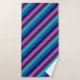 A bath towel featuring a colorful pattern design of diagonal stripes in cool teal, ocean blue, navy blue, plum purple, and lavender.