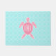 A doormat featuring an illustration of a pink sea turtle over a bright blue quatrefoil background. Personalize the monogram.