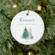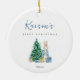 Blue Bunny Rabbit Baby's First Christmas Custom Name Round Ceramic Ornament — The precious personalized xmas ornament template features an adorable watercolor rabbit, standing beside a festive christmas tree with lovely wrapped gifts. The text boxes allow for easy customization of any baby's name in a handwritten calligraphy script font, and birth year in a simple, minimalist sans serif. Both sides of this personalizable, gender neutral keepsake tree decoration are identical.