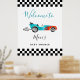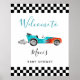 Whimsical race car theme boy's baby shower welcome sign featuring illustration of a blue vintage car with red flames.