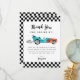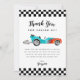 Fun and modern race car theme boy's birthday party thank you message card featuring watercolor illustration of a blue vintage car with red flames. The message thanks guests for attending the party. The text at the top says "thank you for racing by!"