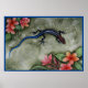 Original watercolor painting by Sandra Gale featuring a Blue-tailed racer lizard or the Five lined skink. This little lizard is common in the US and is shown on green grass between pink plumeria flowers. Great design for anyone who loves nature or spends time in gardens.